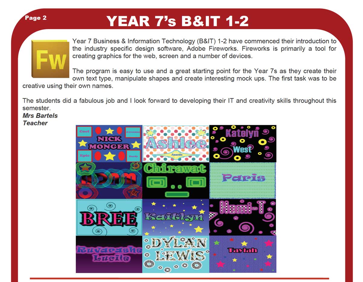 I love seeing examples of Adobe products being used to enhance creativity and IT skills in the classroom. Here are a couple of grabs from a March edition of the Northam Senior High School (Western Australia) newsletter where Angela Bartels (Adobe Education Leader) is working with Year 7 & 8 students using Adobe Fireworks and Photoshop.