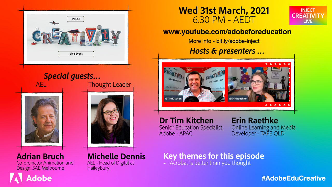 The next episode of Inject Creativity Live is on Wednesday March 31 with Adrian Bruch from SAE and Michelle Dennis from Haileybury. Register here to get a reminder email.