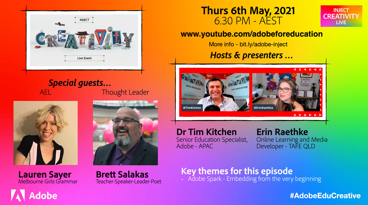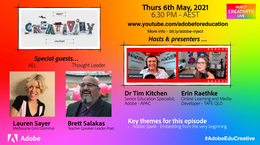 The Inject Creativity Live show continues to be a very popular way for teachers to get some mid-week inspiration either live or on-demand via the Adobe in Education YouTube channel. The March 3 episode featuring Chris Betcher (Program Manager, Google for Education) and Paul McClean (Director, Rare Innovations) gained well over 1000 hits soon after it went to air.