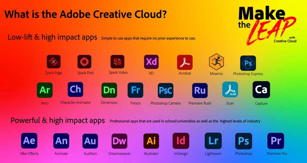 There is still a misconception that Adobe tools are only for high-end users studying or teaching media, arts and design subjects. The following image demonstrates that there are in fact more low-lift apps available within the Creative Cloud.