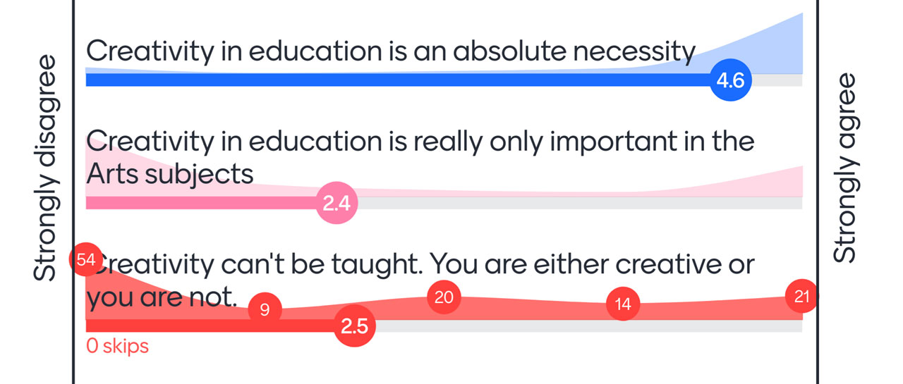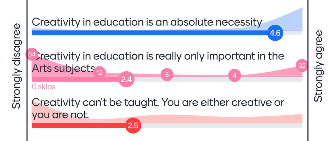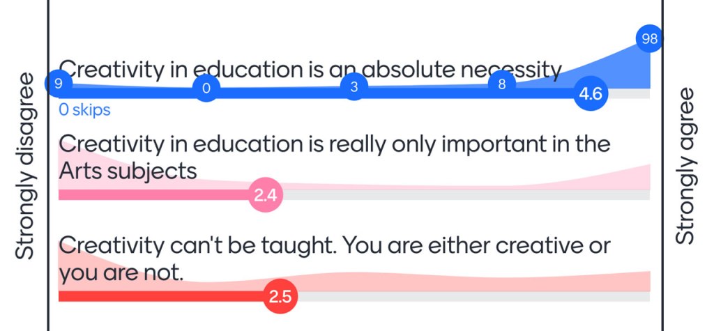 83% Strongly agreed that creativity education is an absolute necessity and 8% strongly disagreed, with everyone else in the middle.