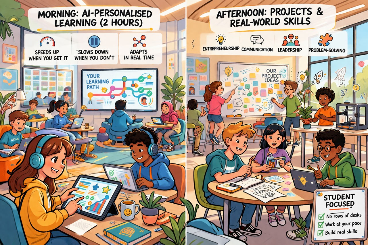 The model sounds surprisingly simple, at least on the surface. Each morning, students spend about two hours working through a personalised learning program powered by AI. It adapts in real time, speeding up when a student gets it, slowing down when they don’t, and constantly adjusting the path.
