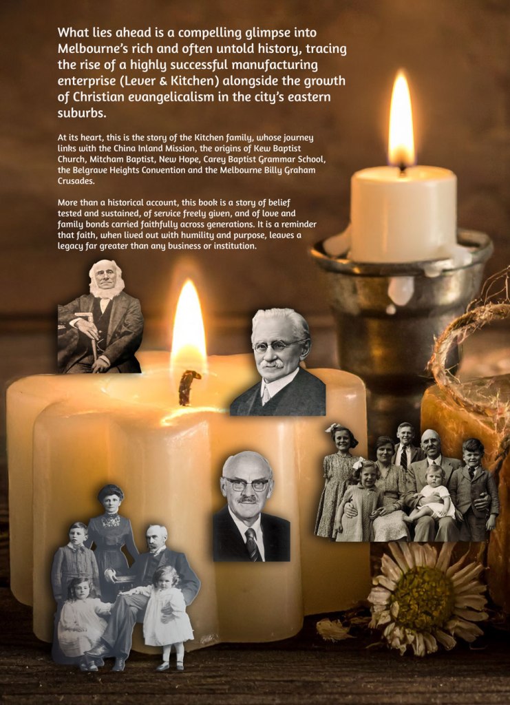 This book … tells of generations of a respected Melbourne family, a Christian family that has impacted many organisations and missional enterprises whilst at the same time being steeped in business and entrepreneurial sense and skills … Enjoy the stories herein. Each central person bears the flavour of their times, the challenges of their lives and the rich thread of faith and determination to live productively and with dedication.