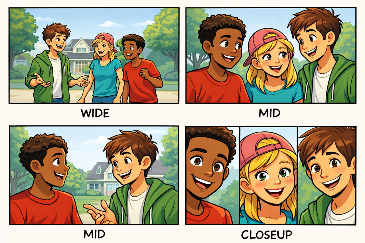 - Shot type (wide, mid, close-up)