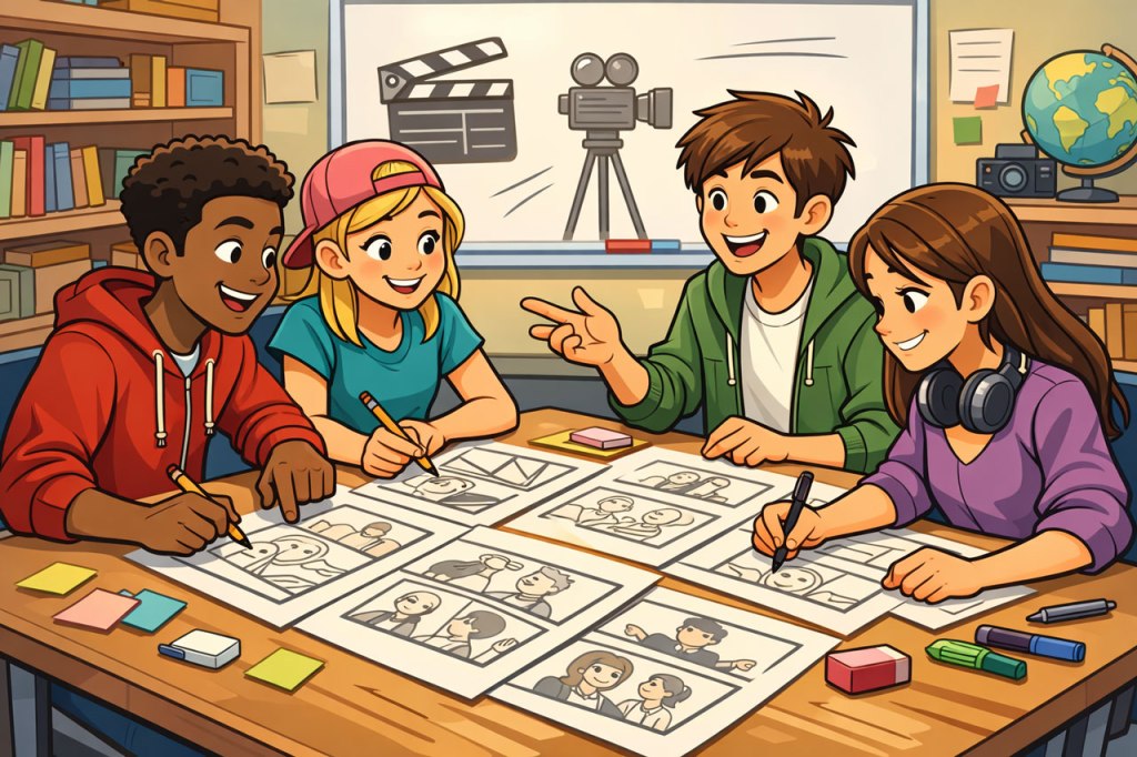 | 1 | Wide Shot (WS) | Establishing shot of classroom with students working | Ambient sound | Sets the scene |